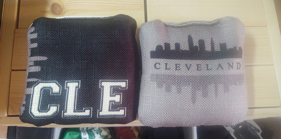 Pro Tournament Direct Print Corn Hole Boards with the City of Cleveland Skyline design on them, with custom dual sided pro bags.