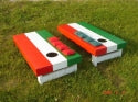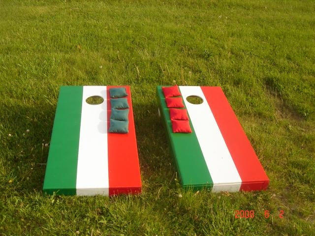 Custom painted, great looking, regulation sized corn hole game set for those who want to show off their italian heritage. Automatically comes with 2 boards and 4 green and 4 red bags!