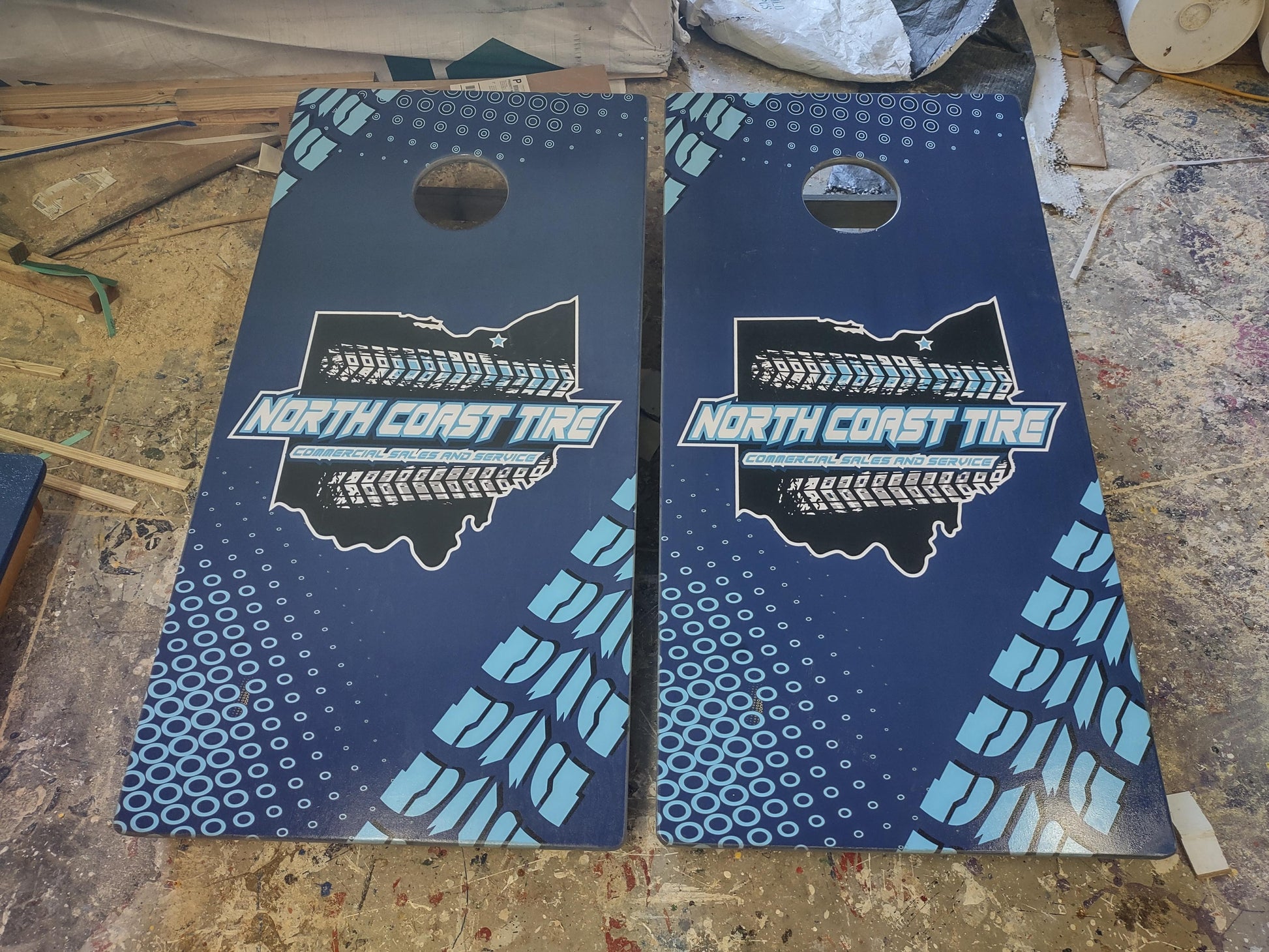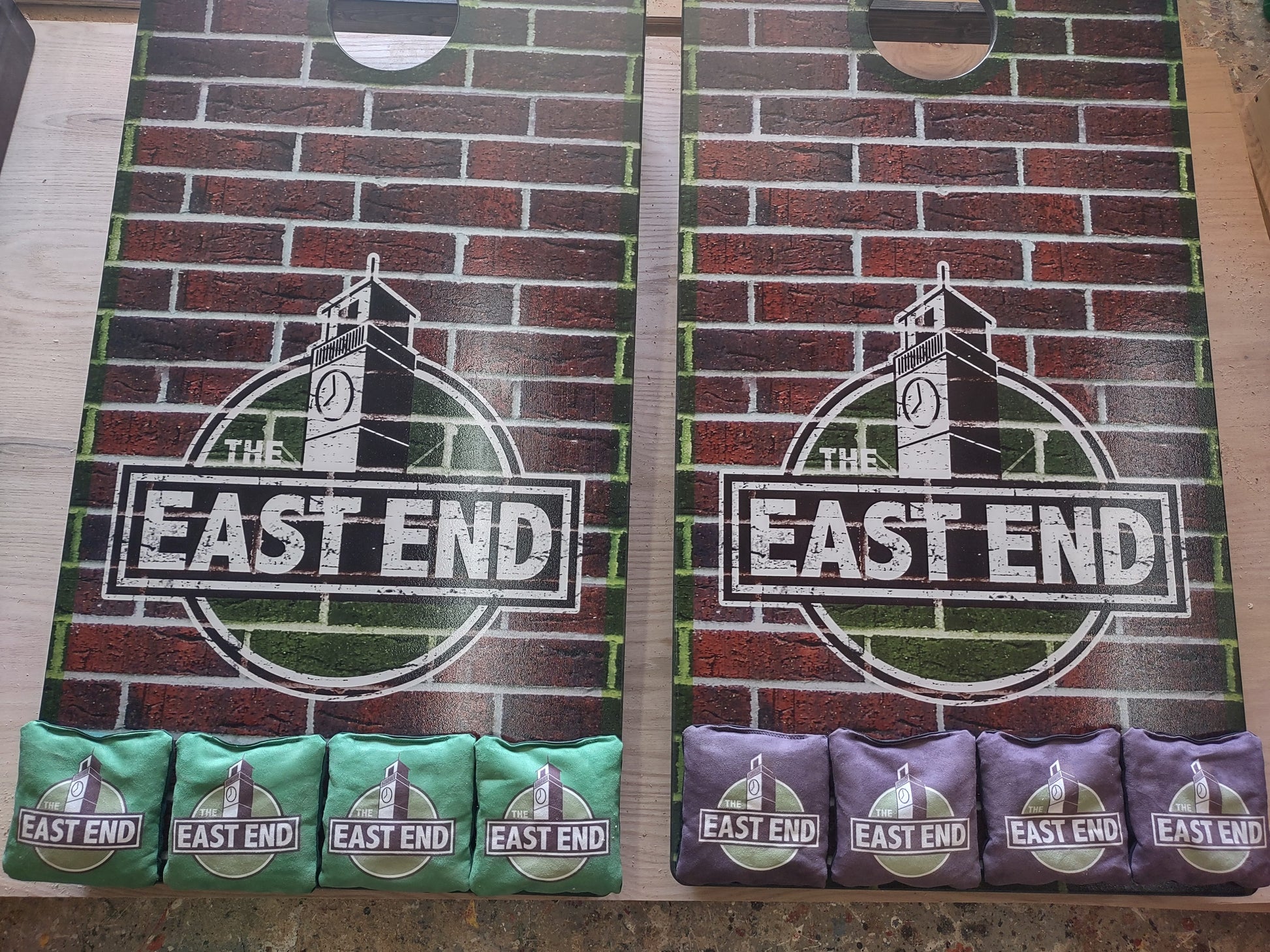 Our top of the line pro tournament construction with 3/4" thick tops, latches and handles on the boards for easy storage and carrying - and dual sided stick and slide bags with your company logo!