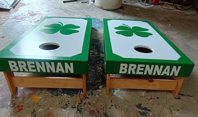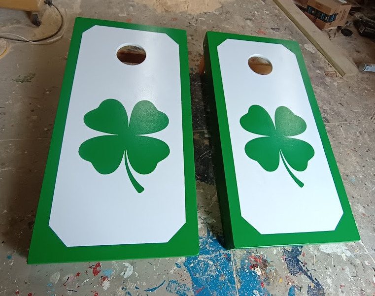 If you are a fan of the fighting irish, or want to show off your irish heritage, than this is the corn hole set for you: 2 regulation sized boards and bags with a shamrock painted on them. Want to do them in navy and old gold? Email us and let us know. We automatically stencil your last name across the back of the boards unless we hear differently.