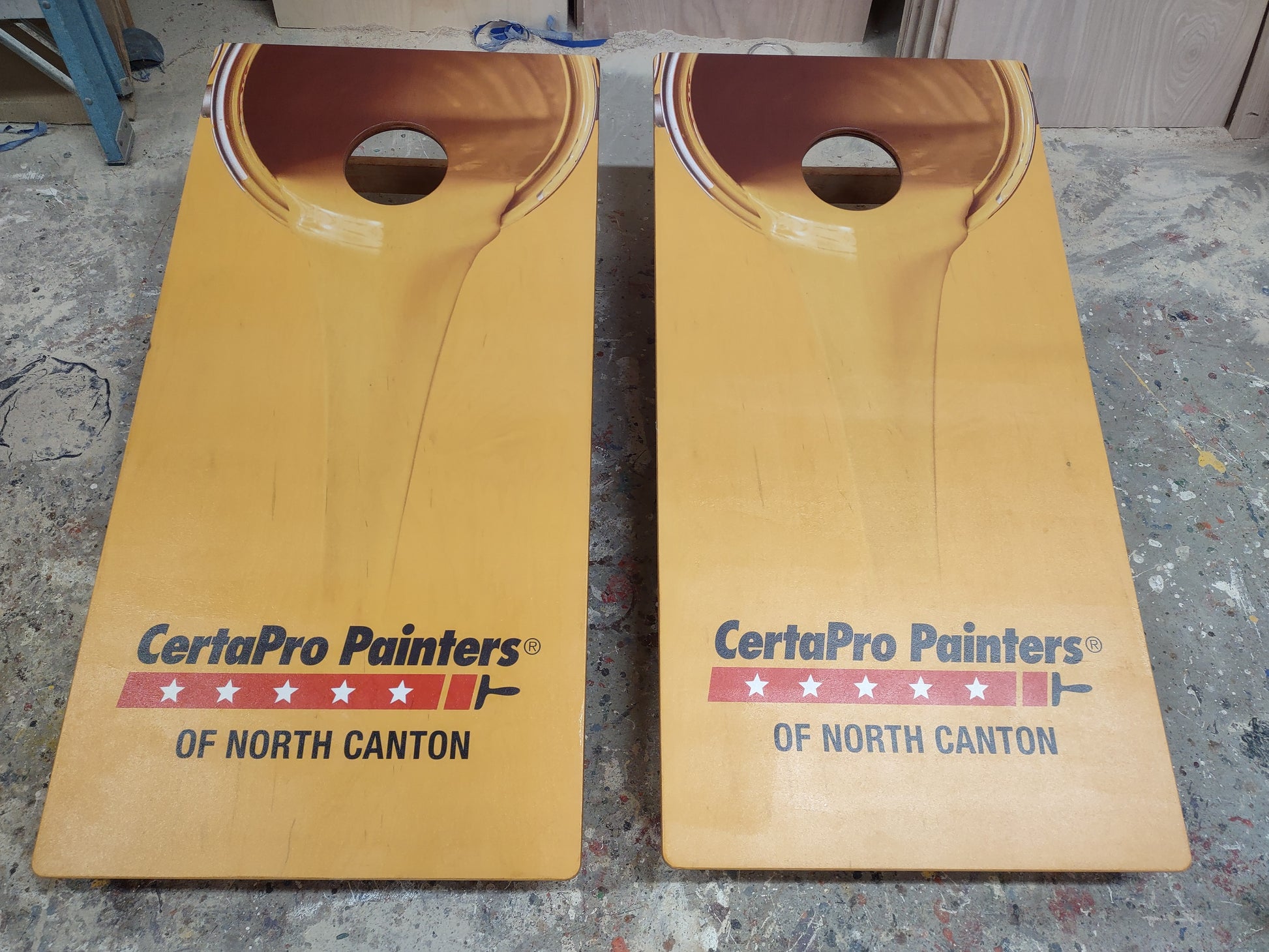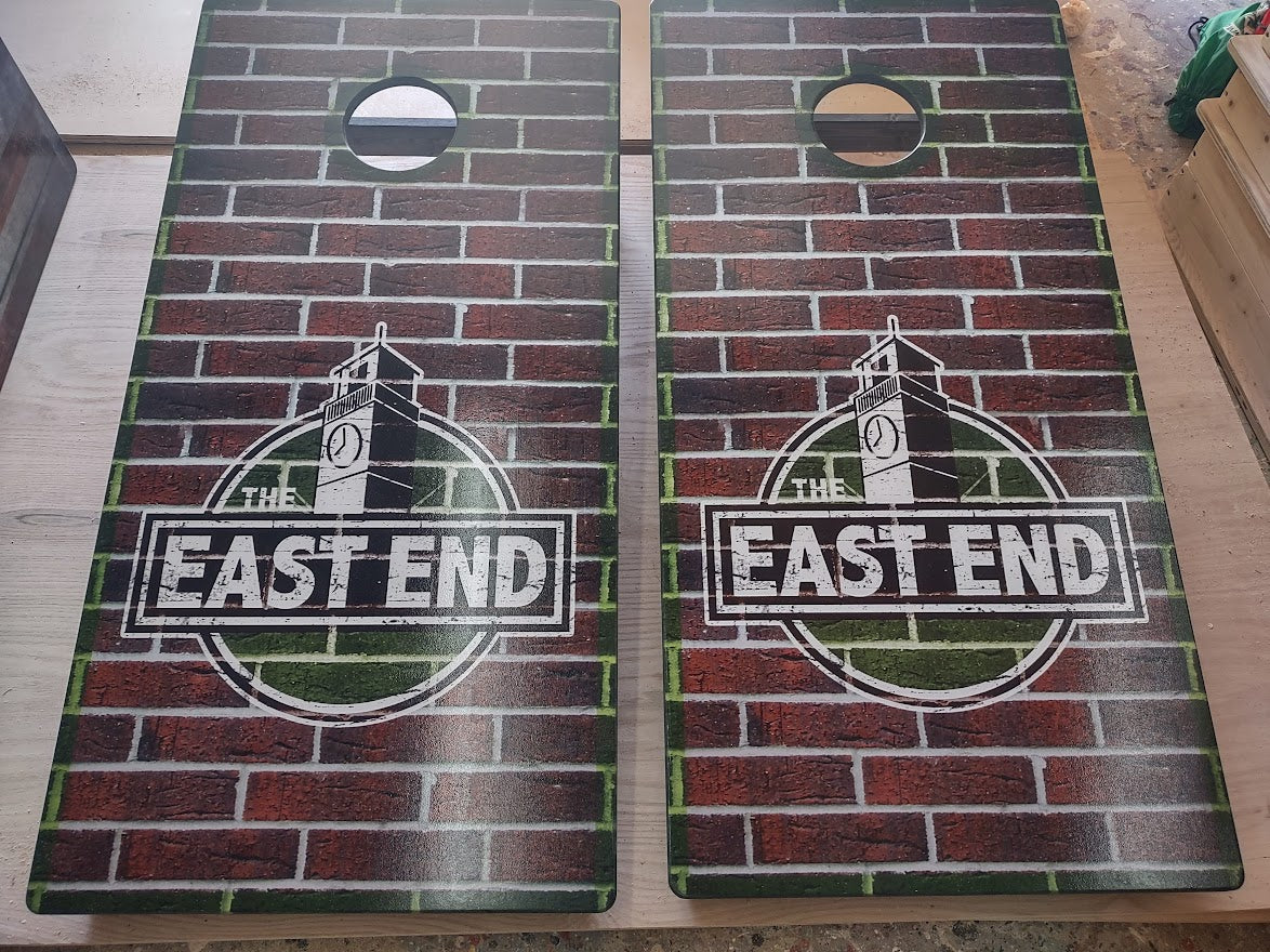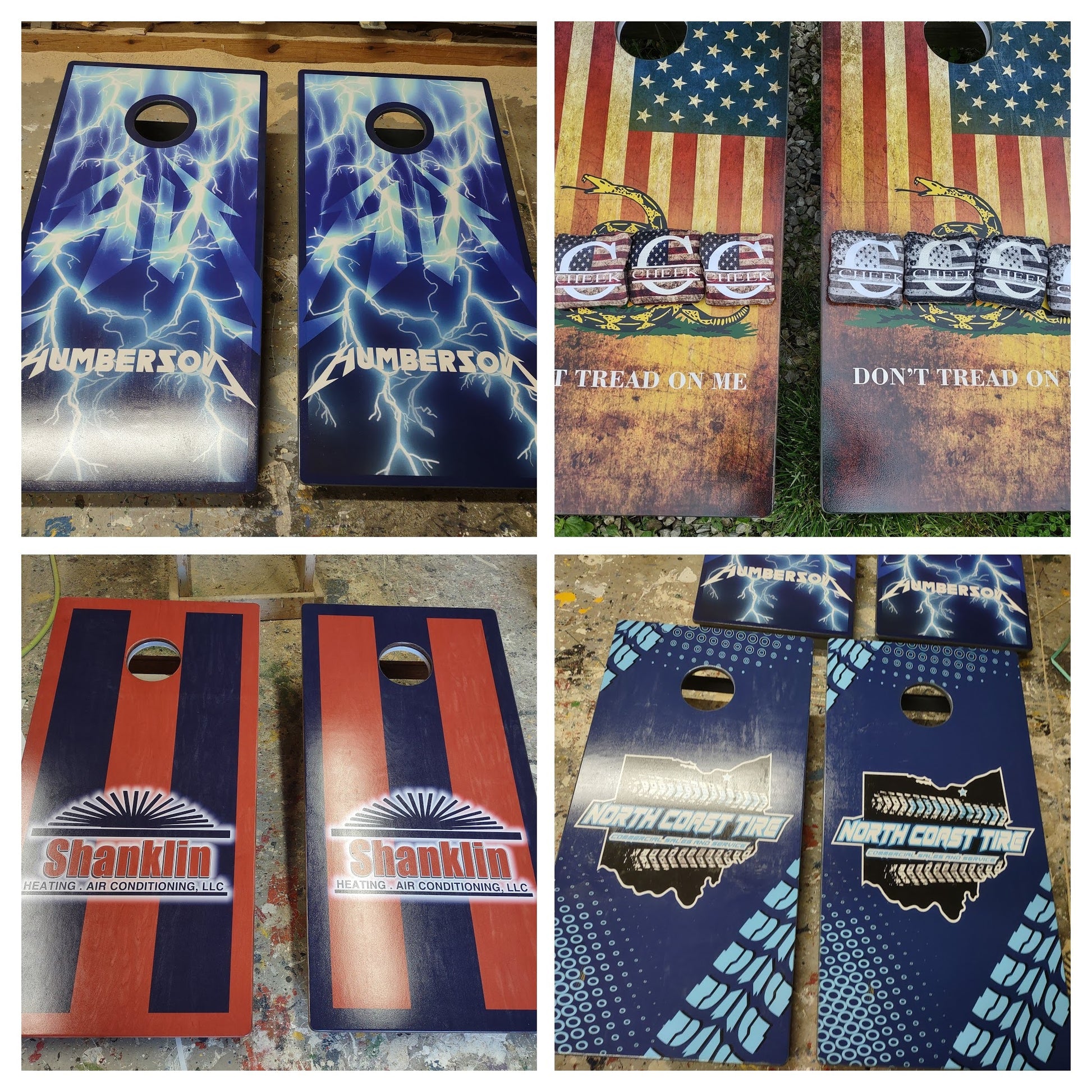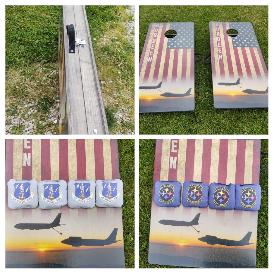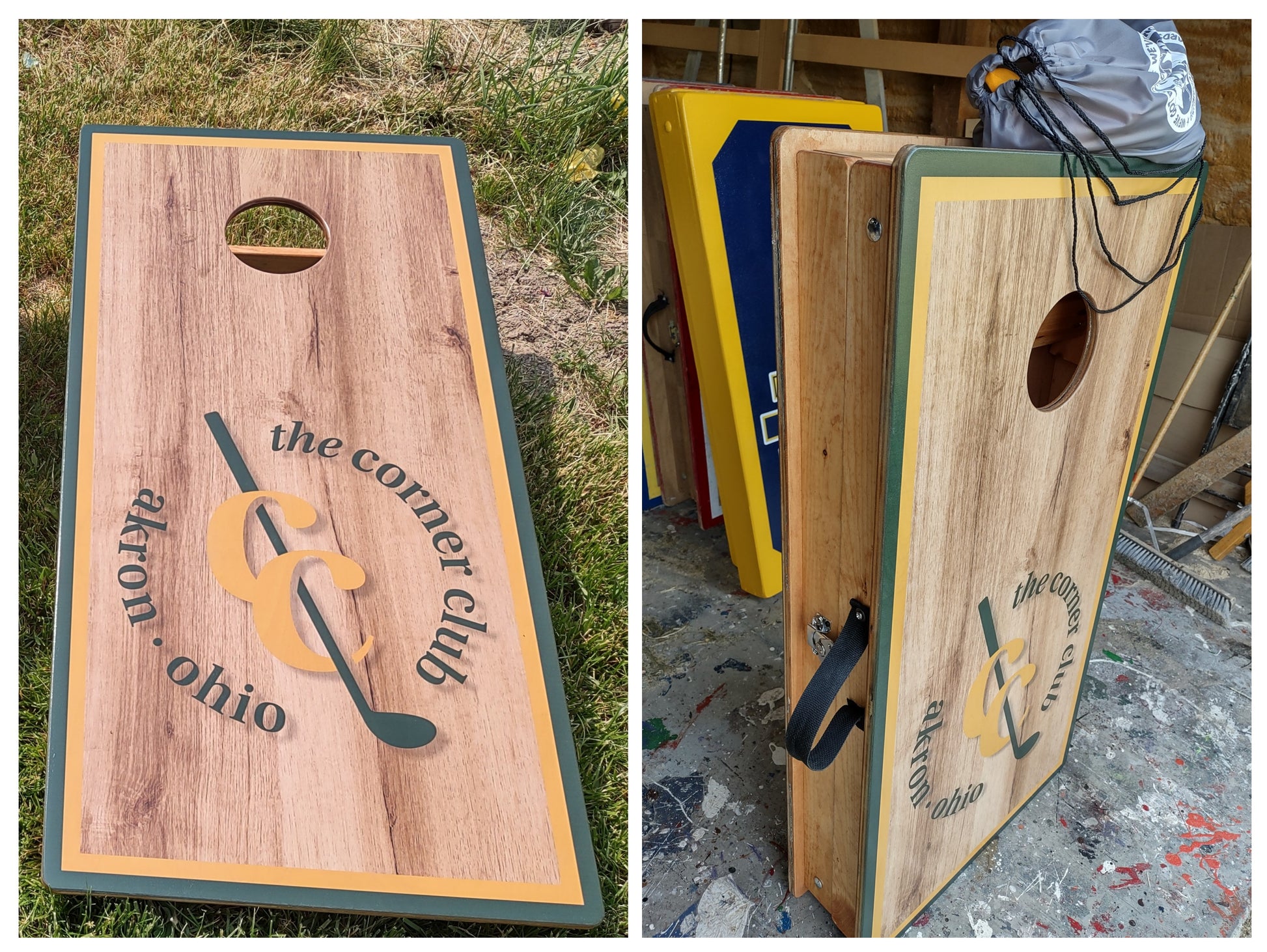 This is our version of the boards you see the pros playing with on TV. Regulation sized. They are 3/4" maple or baltic birch tops with direct printed designs on the board surface. This ensures the most consistent play. The low profile frames are solid pine and legs are braced. As usual, these are fully customized to your liking, and fully finished underneath. The boards have latches and carry handles for storage and transportation.
