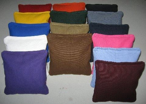 Set of 8 precision weighed/matched bags, made of soft, yet extremely durable duck cloth sewn with extra strong thread to last! Available in red, yellow, royal blue, white, purple, orange, green, khaki, brown, black, gray, navy blue, Pink, North Carolina Blue , and Maroon. These bags are filled with a BTGB Exclusive "Synthetic Corn" material that replicates the playing properties of corn, but with the added convenience of being able to wash them! If they get wet, no problem... just put them out in the sun for a bit and they are just like new. Beer Proof as well! Great for college students and those who leave their sets outdoors. Weigh the same and play similar to corn filled bags.